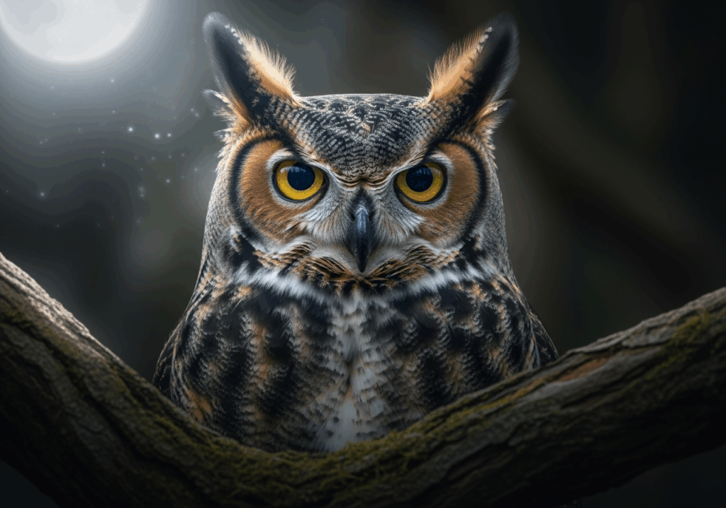 Now, I’d heard owls before—off in the distance, echoing through the woods. But this time, the call cut through the night like it was meant for me. I looked up, and there she was: a great horned owl, perched on the lowest branch of the old maple, maybe ten feet away. She was huge—majestic, silent, with those round, unblinking eyes staring right into mine.